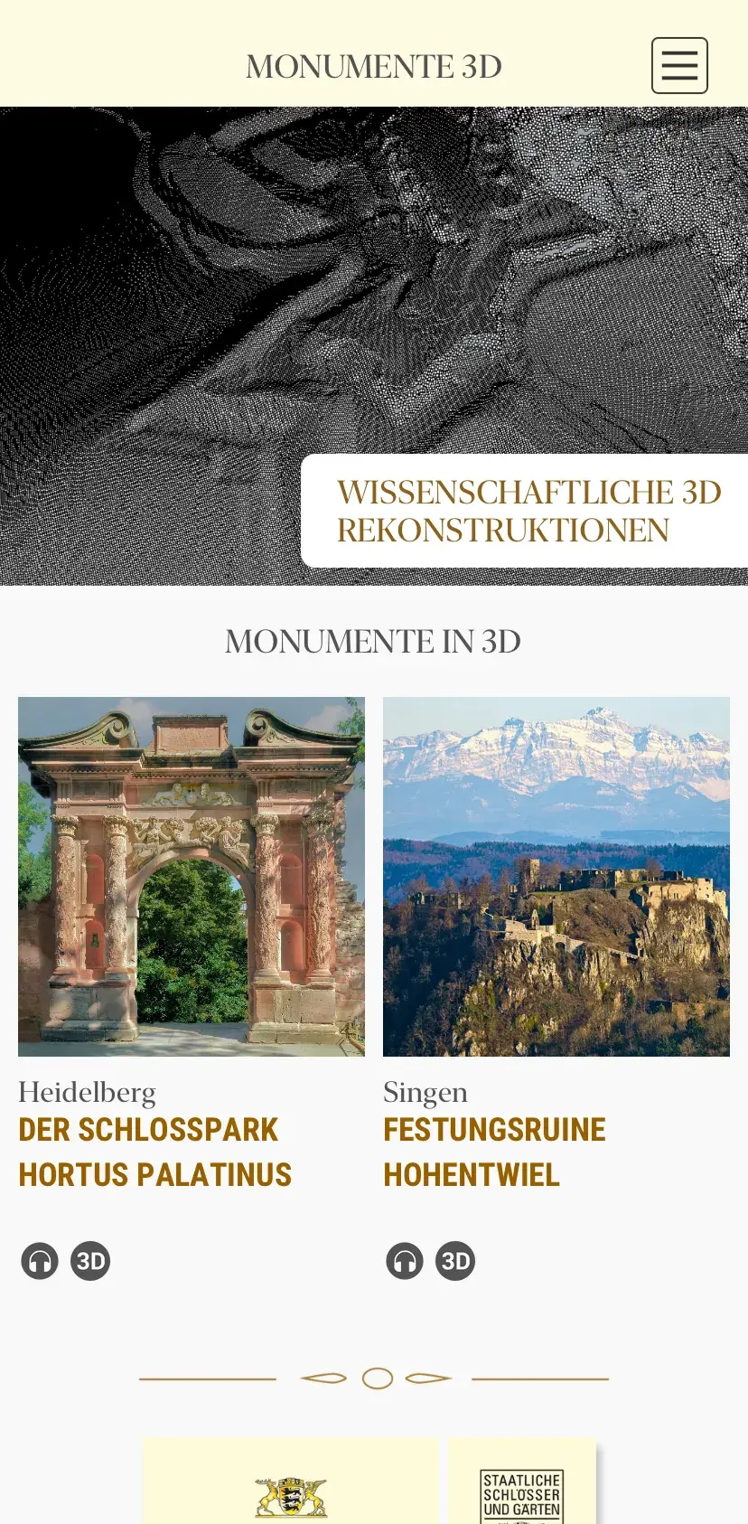 Erleben Sie die Monumente der Staatlichen Schlösser und Gärten Baden-Württemberg in einer neuen Dimension mit der kostenlosen App „Monumente 3D“. Anhand digitaler 3D-Rekonstruktionen können Sie die Ruinen und Gärten des Landes auf einzigartige Weise entdecken.