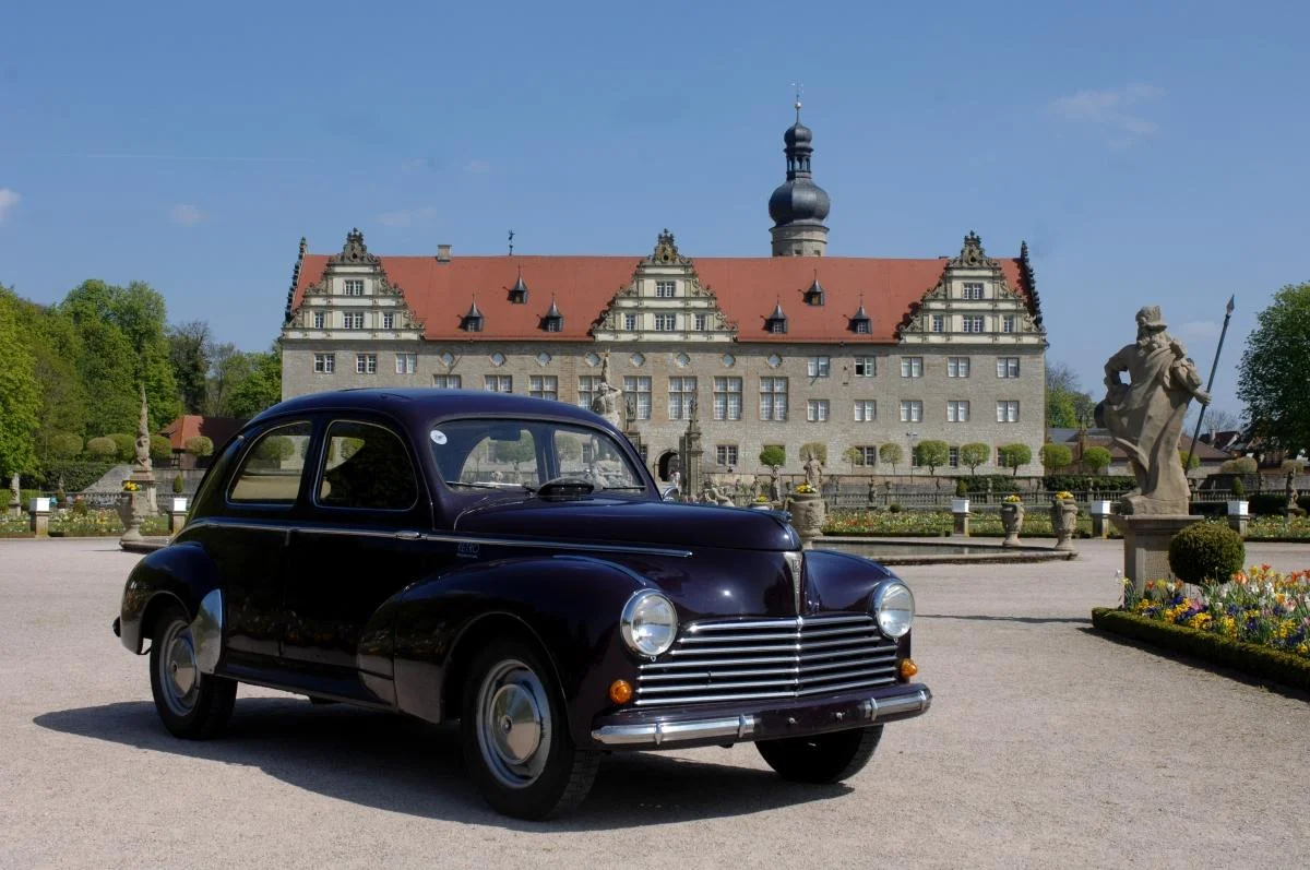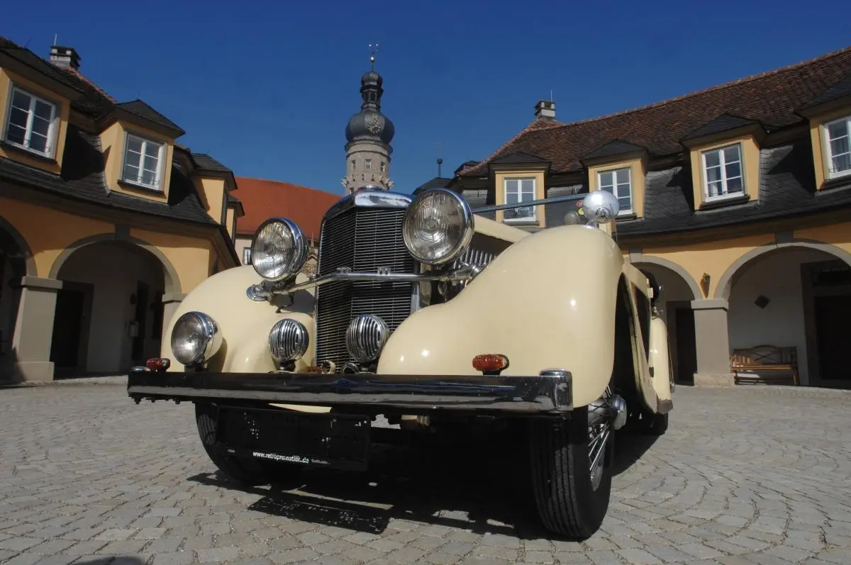 Oldtimerpräsentation weißer Oldtimer vor Schloss Weikersheim