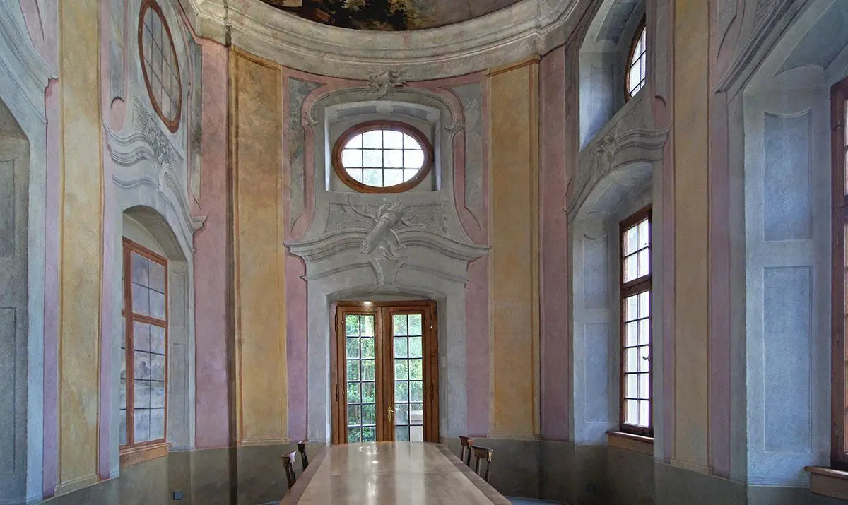 Rückzugsorte im Grünen, an markanter Stelle positioniert: Das waren die Teehäuser, die der engeren Hofgesellschaft als Ausflugsziel innerhalb des eigenen Gartens dienten. In Weikersheim hat sich das Teehaus – mit Grotte im Erdgeschoss! – in der Südwestecke des Schlossgartens erhalten. In Meersburg ist das Teehaus unterhalb der Schlossterrasse mit Blick auf den Bodensee platziert. Es umfasst einen einzigen Raum, dessen Inneres mit einem Deckenfresko verziert ist. Das Motto: „Alles hat seine Zeit“!