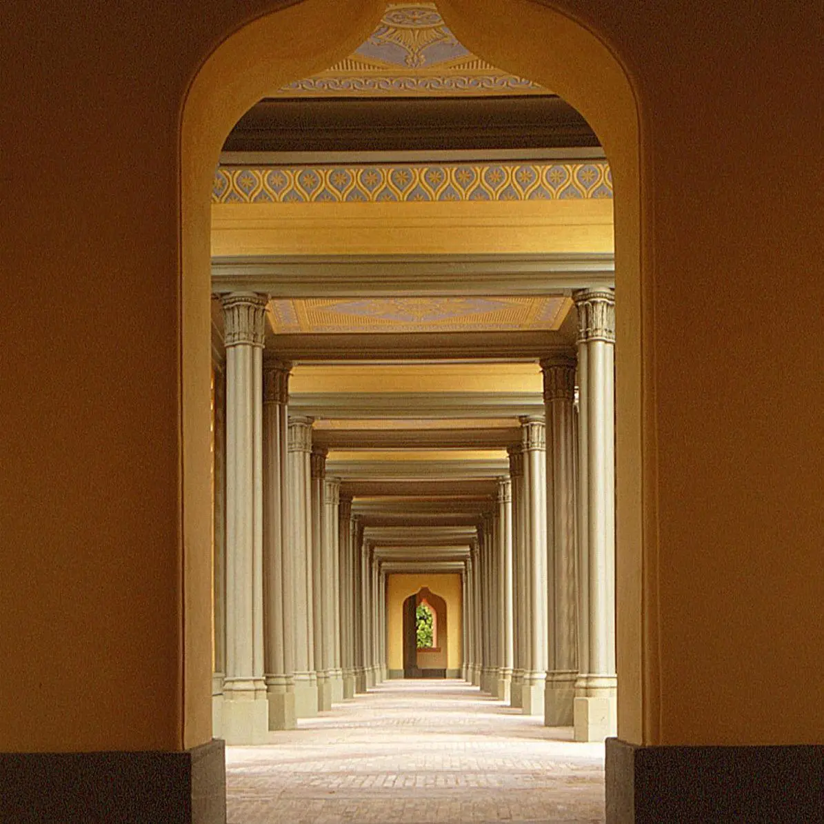 Stimmungsvolle Wandelgänge umgeben den Hof der Moschee und laden zu einem Spaziergang in den Orient.