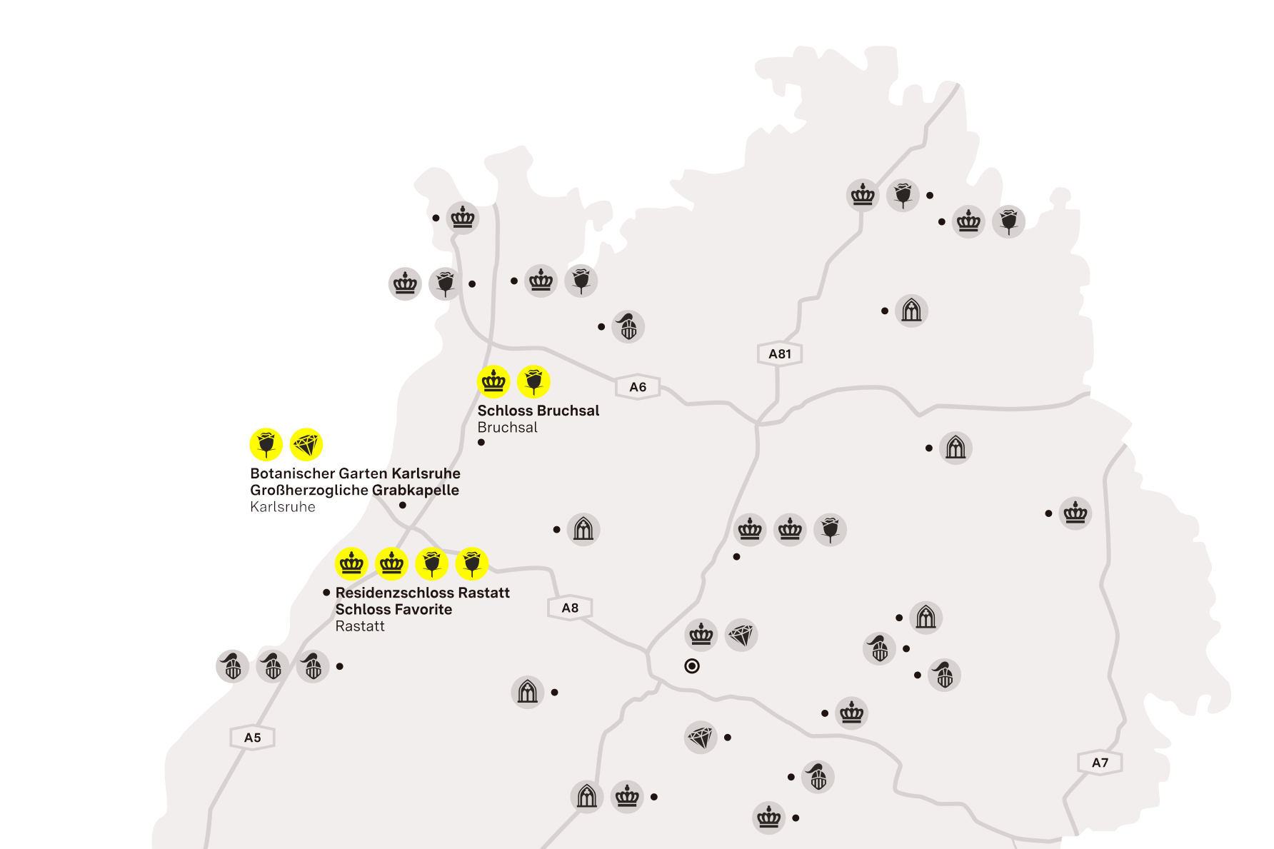Dicht beieinander liegen Schloss Bruchsal, die Residenz der Fürstbischöfe von Speyer, Schloss Rastatt, die Barockresidenz der Markgrafen, und die Zeugnisse der großherzoglichen Zeit in Karlsruhe – Spuren der badischen Geschichte rund um die Badenmetropole Karlsruhe.